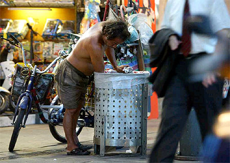 中新網10月19日 據臺灣《中國時報》報道,為救助“新貧一族”,臺灣官方擬修法放寬低收入戶認定標準,受惠者將達四萬五千人。圖為中年游民光著上身,在鬧區撿拾垃圾,與穿著西裝筆挺的上班族形成強烈對比。