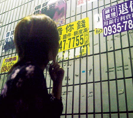 中新網(wǎng)11月1日電 據(jù)臺(tái)灣《中國(guó)時(shí)報(bào)》報(bào)道,臺(tái)當(dāng)局“行政院”十月三十一日通過(guò)“融資公司法”草案,被外界視為“地下錢莊”將可順勢(shì)合法化,草案內(nèi)容規(guī)定自然人年利率上限為百分之二十,法人的上限為百分之三十。圖為市面街道的借貸放款小廣告。