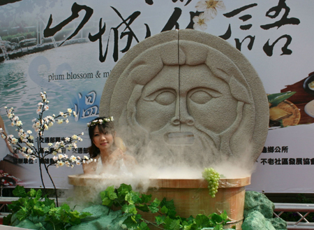 臺灣高雄縣溫泉餐飲業者推出“山城花語溫泉季”活動,四日記者會中的辣妹泡湯,凸顯活動主題!爸醒肷纭眻D 陳守國 攝