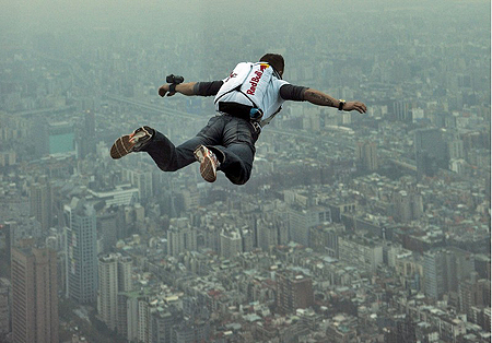 奧地利極限玩家Felix Baumgartner挑戰高樓跳傘,十一日在臺北一○一大樓頂樓一躍而下,完成自世界最高樓跳傘的任務。Baumgartner自三年前一○一大樓完工后便躍躍欲試,經過兩次實地勘查之后,于十一日下午四點十八分自高樓跳下,經過五秒鐘自由落體后成功打開降落傘安全降落!吨袊鴷r報》圖