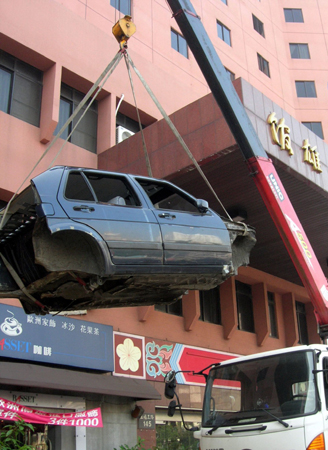 臺(tái)灣戲劇表演家“我是你爸爸”舞臺(tái)劇二十日在高雄市開(kāi)演,劇團(tuán)克服演出場(chǎng)地限制,將一輛報(bào)廢汽車(chē)吊掛至舞臺(tái),在舞臺(tái)上呈現(xiàn)噱頭。“中央社”圖 程啟峰 攝