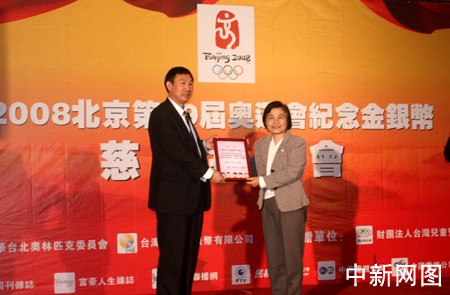 由中國(guó)臺(tái)北奧委會(huì)和臺(tái)灣大洋金銀幣有限公司共同主辦的“二00八北京第二十九屆奧運(yùn)會(huì)紀(jì)念金銀幣慈善拍賣(mài)會(huì)”,二十七日下午在此間信義誠(chéng)品店展演廳舉行,拍賣(mài)所得共新臺(tái)幣三十四萬(wàn)七千元,大洋金銀幣有限公司再補(bǔ)上十五萬(wàn)三千元,共新臺(tái)幣五十萬(wàn)元。全部捐給財(cái)團(tuán)法人臺(tái)灣兒童暨家庭扶助基金會(huì),以幫助弱勢(shì)兒童過(guò)好年。圖為臺(tái)灣兒童暨家庭扶助基金會(huì)社會(huì)處處長(zhǎng)翁慧圓(右一)向臺(tái)灣大洋金銀幣有限公司總經(jīng)理畢海頒發(fā)感謝證書(shū)。作者:陳立宇