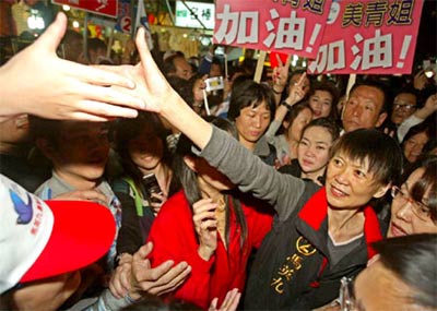 國民黨候選人馬英九夫人周美青,十三日晚間到高雄市瑞豐夜市拜票,有人支持有人嗆聲,但是周美青情緒都未受影響。臺灣《中國時報》圖 謝明祚 攝
