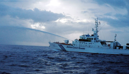 臺灣“全家!北a灤沾钶d著保釣人士前往釣魚島宣示“主權”,不過,日本保安廳巡邏艦出動十多艘,還噴水、企圖碰撞、排黑煙、及蛇行引側浪企圖阻撓。保釣人士丟擲飲料瓶抗議!爸醒肷纭眻D