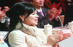 2009年1月23日鴻海舉辦年終尾牙,董事長郭臺銘開心地開起玩笑說,“大家要努力,因為大家的努力,關系到我未來下一代的奶粉錢”,在臺下愛妻曾馨瑩,面帶微笑聆聽郭董談話。圖片來源:中國時報