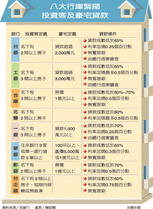 對投資客最嚴的是臺灣企銀,董事長羅澤成說,只要個人名下有三間以上的房子,符合房子未裝潢、短期移轉等條件,利率將大幅加碼0.75個百分點,貸款成數上限也只有六成,同時取消寬限期。