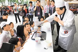 臺北館1日也舉行牛肉面試吃活動,許多游客攜家帶眷,讓小朋友優先排隊嘗美食。