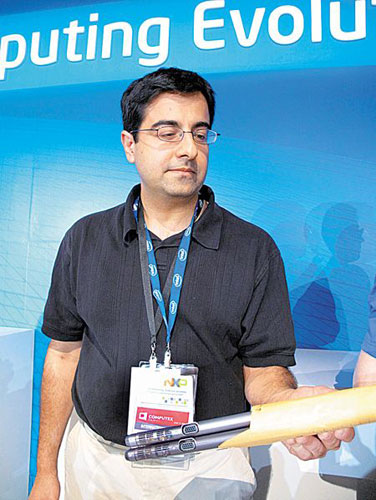 英特爾公開展示了厚度僅1.4公分,全球最薄隨身型易網機,2臺可一起放進牛皮紙袋里。 圖片來源:臺灣《中國時報》