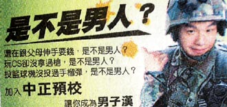 中新網(wǎng)4月8日電 據(jù)臺(tái)灣《聯(lián)合報(bào)》報(bào)道,只有男人才能念軍校?臺(tái)當(dāng)局“國(guó)防部”中正預(yù)校今年的招生廣告,斗大的標(biāo)題《是不是男人?》讓民代薛凌痛批軍方性別歧視,貶抑女性。
