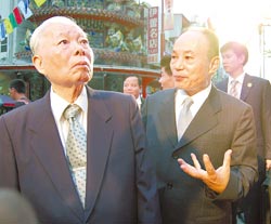 張克輝(左)認真聽著奉天宮董事長何達煌(右)講解奉天宮的歷史和建筑特色,眼神專注盯著奉天宮的屋頂