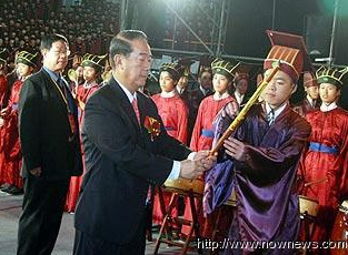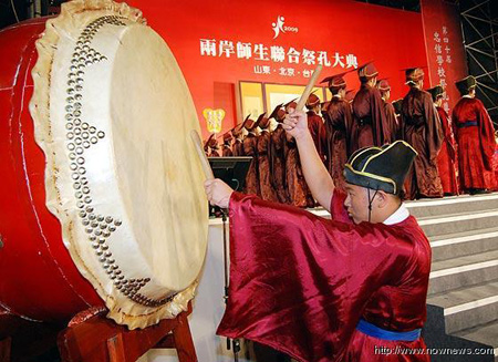 中新網9月27日電 2009年第二屆中華文化快車兩岸師生聯合祭孔大典今日上午在新竹隆重登場,祭孔大典更開創先例,透過因特網同步同時在新竹、北京、山東三地聯合進行,萬余名兩岸師生共同參與。親民黨主席宋楚瑜更第二度應邀擔任祭孔大典正獻人,這也是近60年以來,臺灣民間祭孔規模最大的一次集會。