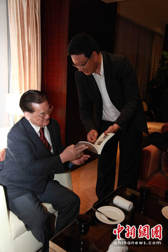 中新網杭州5月2日電 (記者嚴格)正在杭州參訪的中國國民黨榮譽主席連戰5月2日晚在其下榻的賓館會見了中新社浙江分社社長王旻及多次采訪連戰的分社記者,并接受了由中新社浙江分社與浙江省臺辦共同編撰的《浙臺口述歷史》一書。