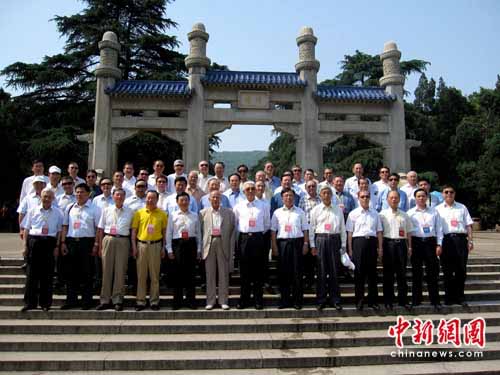 中新網南京5月24日電(記者 唐娟)24日下午,來自海峽兩岸的40余位退役將領拜謁中山陵。黃埔軍校同學會林上元會長主持拜謁儀式,來自臺灣的黃幸強上將和大陸的錢樹根上將代表兩岸退役將領向孫中山坐像敬獻了花圈。