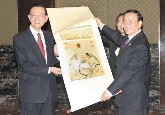 中新網(wǎng)6月12日電 據(jù)臺(tái)灣《聯(lián)合報(bào)》報(bào)道,浙江省長呂祖善率領(lǐng)的浙江省代表團(tuán)十一日到新竹科學(xué)園區(qū)、工研院、臺(tái)積電參訪,中午與晚間分與臺(tái)灣呂氏宗親及中部三縣市長、“立委”們餐敘。“立委”呂學(xué)樟以世界呂氏宗親會(huì)理事長身份款待呂祖善一行,呂祖善回贈(zèng)“呂祖謙全集”共十六冊(cè),他說從未遇過這么盛大的懇親會(huì)場(chǎng)面,非常溫馨。