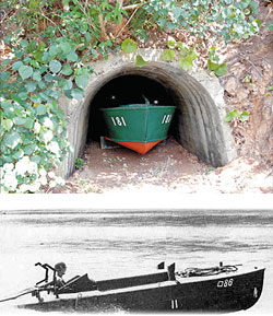 二戰末期,日本以高速艇組成自殺攻擊的震洋特攻隊,上圖為位于日本奄美大島中的第18震洋水上特攻隊用來藏自殺快艇的洞穴,下圖為震洋水上特攻隊快艇。圖片來源:中國時報