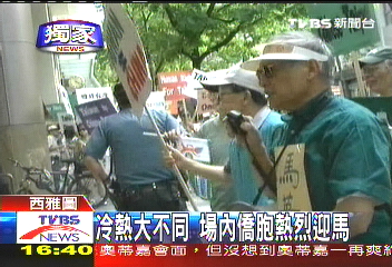 而飯店里的挺馬僑胞也不停在喊支持口號,才讓馬英九開心地笑了,挺馬僑胞的歡呼聲一時間蓋過了場外的嗆聲。而反馬僑胞仍舊拼命表演,手上高舉“ONE TAIWAN ONE CHINA”的“臺獨”標語,徹底惹毛了飯店2樓的挺馬僑胞,忍不住沖下了樓,戰火一觸即發。