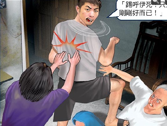 沈父倒在地上不斷哀號,在房內(nèi)睡覺的沈弘隆姑姑趕緊跑出來察看,大喊:“不要打了!”一把將侄子推開說:“當(dāng)兒子的,怎么可以打老爸。”但沈弘隆失去理性,還回嗆姑姑說:“踢呼伊死(指沈父)!只是剛剛好而已!”甚至拉開姑姑,再踢了父親一腳,才掉頭逃離現(xiàn)場。