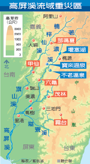 高雄縣消防局救災(zāi)中心昨天下午陸續(xù)接到報(bào)案,接近中央山脈末端的啞口與梅山口一帶下起豪大雨,造成梅山口一處堰塞湖宣泄不及而潰堤,山洪爆發(fā)后,荖濃溪洪水急漲,挾帶大量土石流向桃源鄉(xiāng)勤和村沖刷而下。