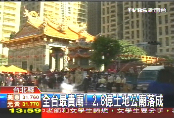 中新網(wǎng)1月19日電 據(jù)臺灣TVBS報道,臺北縣的深丘福德宮,因為蓋在黃金地段的新板特區(qū),以2年前一平米200萬(新臺幣 下同)的地價計算,這間土地公廟地價已經(jīng)高達2.8億,號稱是全臺最貴的廟。之前因為采購法遲遲無法完工,最近終于蓋好了,上午舉行安座大典,神明搬新家,場面相當熱鬧。