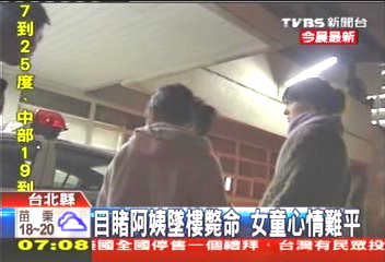 中新網2月1日電 據臺灣tvbs報道,31日晚間,臺北市傳出墜樓意外事件!一名林姓女子因忘記帶鑰匙,想爬窗從陽臺開門,卻失足從4樓的摔下,當時陪在一邊的小妹妹目擊整個過程,嚇到不愿意再回想這段恐怖的經驗。