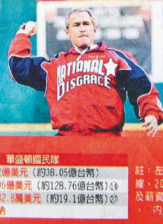 中新網(wǎng)3月19日電 據(jù)臺(tái)灣《聯(lián)合報(bào)》報(bào)道,臺(tái)媒體《自由時(shí)報(bào)》18日刊登2005年當(dāng)時(shí)美國(guó)總統(tǒng)布什開球的照片,但沒(méi)想到搞了“大烏龍”,把球迷合成的照片當(dāng)成正版,布什穿上寫著英文“國(guó)恥”的球衣,好不尷尬。