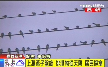 中新網4月6日電 據臺灣TVBS報道,嘉義新港地區最近出現大批燕子聚集,昨天(5日)是清明節,數量更超過5萬只,引起當地居民圍觀。居民說燕子多好像是代表福氣來,不過排泄物卻讓他們很困擾,出門都要撐傘,以防被鳥屎擊中。