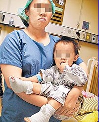 她從銀行回來后,見兒子坐在報紙堆上不敢下來走動,下午五時幫兒子換尿布才發(fā)現(xiàn)兒子雙腳腳掌都起大水泡,趕緊將兒子送到高雄長庚醫(yī)院急救,被診斷有二至三度燙傷,轉(zhuǎn)入燒燙傷病房,至少需住院一周。