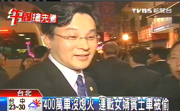 現在失竊率高,連戰的女婿陳弘元也遭殃,上周五,陳弘元和妹妹,到新竹竹東鎮拜訪易經老師,趁著空檔,司機開黑色奔馳車到超商繳停車費,一時疏忽,車子沒有熄火,短短幾分鐘,車子被兩名歹徒開走。