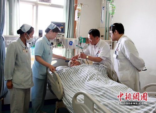 中新網長沙5月6日電(劉柱 伍西明)“多虧醫院救了我丈夫的命,歡迎你們來臺灣做客!”在湖南湘雅醫院重癥醫學科(ICU病房),剛剛從臺灣趕來長沙的臺胞患者梁登輝的夫人對病房里的醫生和護士們連聲感謝。