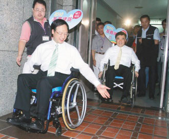 江宜樺與郝龍斌2日在ENJOY餐廳共同貼上“友善建筑”貼紙,象征2010年友善建筑的評(píng)選活動(dòng)正式開跑;隨后兩人也坐上輪椅,從ENJOY餐廳出發(fā),一路經(jīng)過市府走廊,到無障礙設(shè)施廁所,體驗(yàn)身障者的不便。