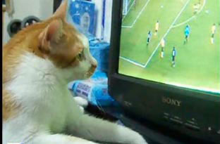 中新網(wǎng)6月22日電 據(jù)臺(tái)灣“今日新聞”報(bào)道,2010世界杯足球賽不僅是全球人們關(guān)注的焦點(diǎn),連貓咪也喜歡,據(jù)了解,臺(tái)灣一只名叫加菲(GARFIELD)的貓咪,竟然緊貼在電視機(jī)前,無(wú)比專注地盯著轉(zhuǎn)播,還會(huì)激動(dòng)地伸出貓爪,對(duì)著熒幕又拍又打。