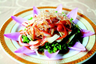 新興園購入一斤將近3百元的蘭花蚌,將蚌肉汆燙后以冰塊冰鎮,保持蚌肉彈性;在盤中鋪上一圈香水蓮花花瓣,淋上少許色拉,再放上切絲洋蔥做底;將蘭花蚌肉放在洋蔥上,加上少許脆藻,最后淋上特調和風醬,一盤如蓮花盛開的料理就呈現在眼前。
