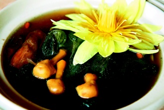 劉邦傳說,新興園的烏骨雞湯和一般雞湯不同,以蓮蓬、蓮子等堅果類食材清燉,加上巴西蘑菇,營養程度高。
