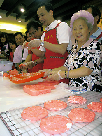 中新網6月22日電 據“中央社”報道,國民黨新北市長參選人朱立倫22日到汐止市百年紅龜粿店,與75歲的劉余銀奶奶一起做紅龜粿,朱立倫毫不生疏、架勢十足,讓老奶奶猛稱贊,并給了他90分的高分。