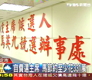 馬英九這回競選黨主席全花私人存款,包括付給黨中央的作業費200萬,70多坪辦公室約40天的租金17萬元,競選活動14天,下鄉的油料費約84萬,文宣以及團隊下鄉的交通費、雜支,這回競選最少331萬元。