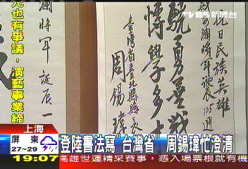 據臺媒報道,在上海的書畫展中,臺北縣長周錫瑋送去的書法,上面落款寫的是“臺灣省臺北縣長周錫瑋”,“臺灣省”三個字引發島內討論。