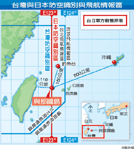 臺日之間的防空識別區界線正畫過與那國島上空,這是雙方軍方戰管的界線。航空自衛隊干部說,臺灣戰機升空,可能是對日本想要在與那國島駐軍表達不高興。但是因為與那國島正好在東經123度的防空識別在線,日本也無法對臺灣表示抗議。