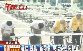 中新網8月21日電 據臺灣TVBS報道,馬英九20日再度南下勘災,每到一個地點都先彎腰鞠躬、道歉,不但親自擔任司儀、和災民擁抱、蹲下來跟災民一起燒紙錢,遇到鄉長反應災情,皺眉聽得很仔細,還要一旁“立委”不要插話,身段顯得很柔軟。