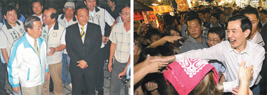 中新網11月1日電 馬英九與謝長廷曾是去年臺灣“大選”競爭對手,10月31日不約而同到宜蘭縣分別為國民黨和民進黨縣長候選人呂國華、林聰賢造勢拼人氣。兩人同時逛熱鬧夜市,兩路人馬一度狹路相逢,互別苗頭,令警方如臨大敵。