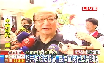 胡志強日前曾遭到一名大學生亮刀嗆聲,維安問題再度被關注。臺中市警局擬提高維安規格,比照“直轄市長”,胡志強表示尊重專業,絕對配合警方。