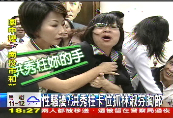 據臺灣TVBS報道,國民黨“立委”洪秀柱跟民進黨“立委”林淑芬,為了搶發言臺的位置,洪秀柱從后方抓林淑芬,不偏不倚剛好抓住林淑芬的胸部,后來為了卡位,洪秀柱的頭,又卡在男性“立委”蘇震清的胯下。