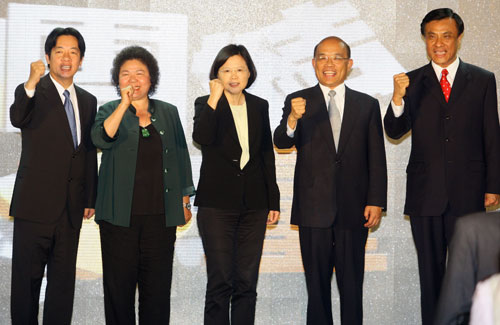 民進黨中執(zhí)會昨日下午正式通過黨內(nèi)提名人選,大高雄陳菊、大臺南賴清德、大臺中蘇嘉全、新北市蔡英文、臺北市蘇貞昌,民進黨中央分別以“愛、勤、信、知、拼”五字,凸顯五人特質(zhì)。