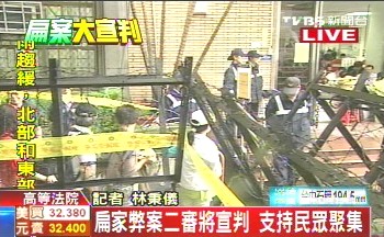 中新網6月11日電 據臺灣TVBS報道,陳水扁家族涉及的公務機要費、南港展覽館、龍潭購地及洗錢案等案,臺灣高等法院于11日上午二審宣判;高等法院場外聚集了一堆挺扁、反扁民眾等候判決結果,警方派出大批警力,進行周邊出入管制,嚴防沖突發生。