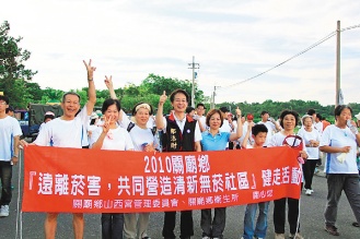 昨天清晨的全民健行活動有3000鄉民參與,山西宮主委張伯祿、副主委汪忠政等率隊出發,一路走到風景優美的大潭埤旺萊公園,關廟衛生所配合舉辦反煙倡導、衛教倡導活動。