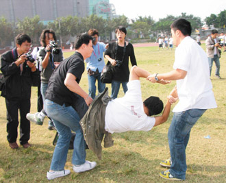 廖姓學生與安全人員拉扯,躺在地上大喊“樂生依法定古跡”,被抬離現場。同行一名瘦小的王姓女學生走近想幫忙,卻被安全人員來一記過肩摔,雖無明顯外傷,已受到驚嚇。不少學生氣憤地說:“嗆得好,我們都快活不下去了。”