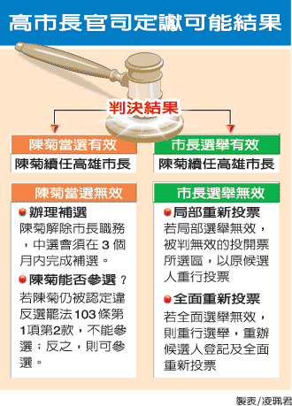 據臺灣媒體報道,一旦法院二審判定選舉無效或當選無效,依“選罷法”必須在三個月內完成重新選舉。如果二審判定是“選舉無效”,根據“選罷法”第一○二條,其違法屬選舉之局部者,就該局部無效部分定期“重行投票”,否則就是全面“重新選舉”;如果法院的二審判定是“當選無效”,則要進行“補選”。若是選舉無效,陳菊可以再次參選,如果是當選無效,陳菊就不能再補選了。