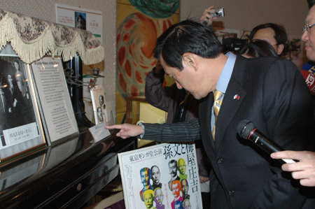 在下午忙碌的活動中,馬英九也抽空前往位于日比谷公園內的松元樓,參觀與當年孫中山先生流亡日本時有關的史跡。松元樓現任社長夫人的祖父梅屋莊吉早年曾對流亡中的孫中山提供很多的協助,孫中山是一九一五年在梅屋的家與宋慶齡舉行婚禮的。松元樓的負責人親自為馬英九說明過去的這段歷史。