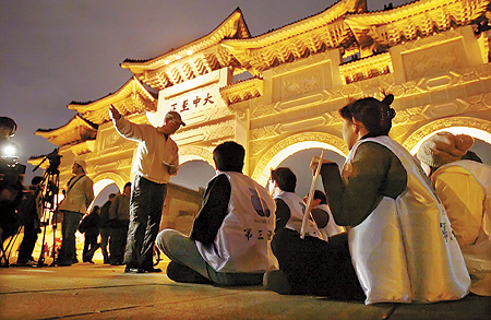 臺灣當局“教育部”計劃拆除臺北中正紀念堂前的“大中至正”牌匾,引發當局與臺北市政府之爭,第三社會黨發起人周奕成(坐地左一)等成員組成“維和部隊”四日晚間到場靜坐呼吁藍綠停止惡斗,暫停拆除。臺灣《中國時報》圖 姚志平 攝