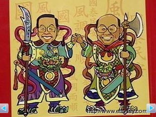 原本農歷上的門神變成了謝長廷與蘇貞昌兩人的卡通造型,底下一行“長”治久安,更是意有所指。