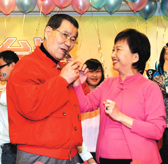 蕭萬長參加情人節(jié)活動 與夫人互喂巧克力(圖)